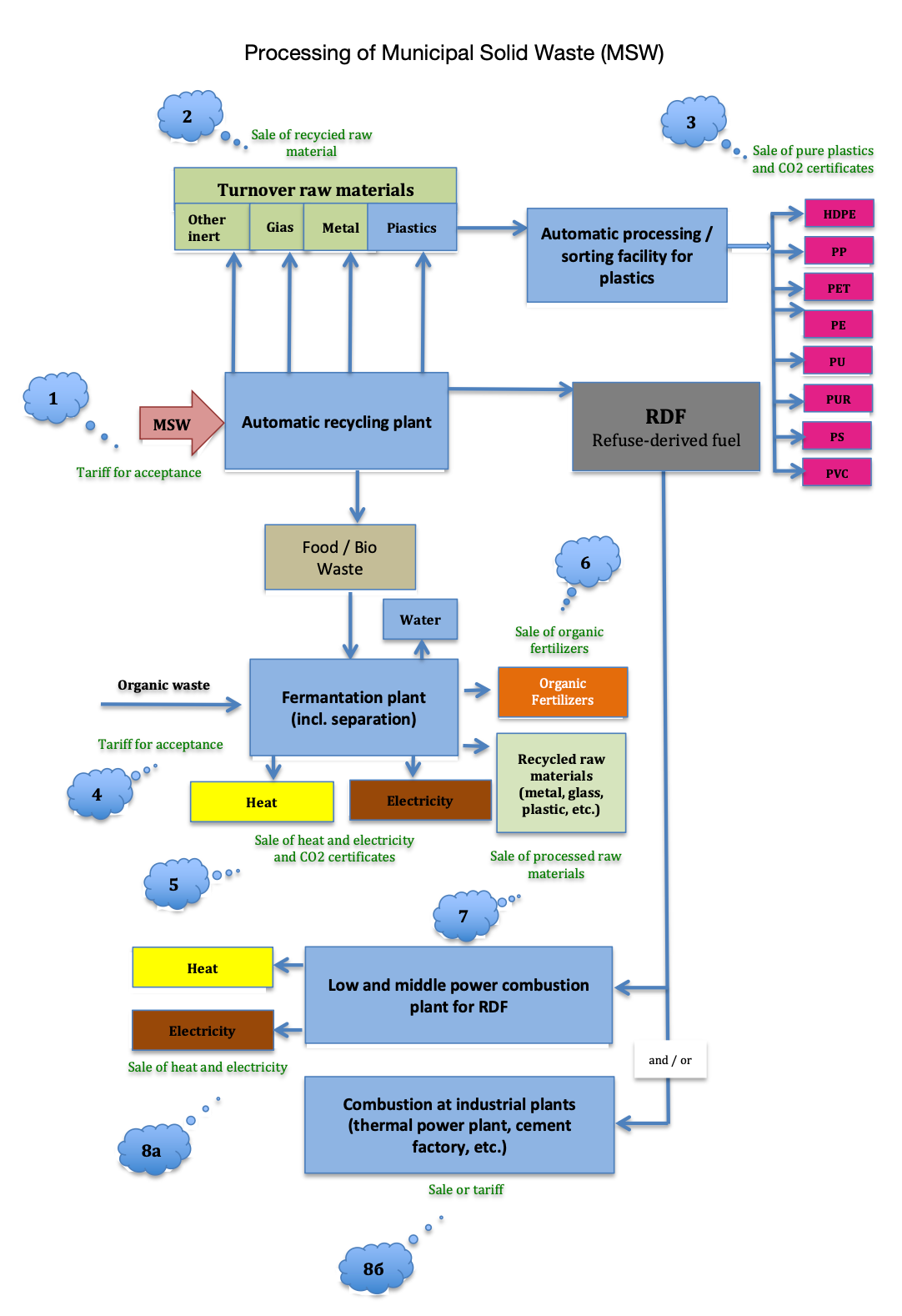 Refuse-Derived Fuel is a type of fuel produced from processed waste. The process involves extracting valuable materials, such as metals and glass, followed by drying and fractionating the remaining residues. The obtained RDF can be used for energy production instead of traditional fuels like coal or natural gas. This helps reduce waste volume, promotes recycling, and contributes to energy production with lower environmental impact.